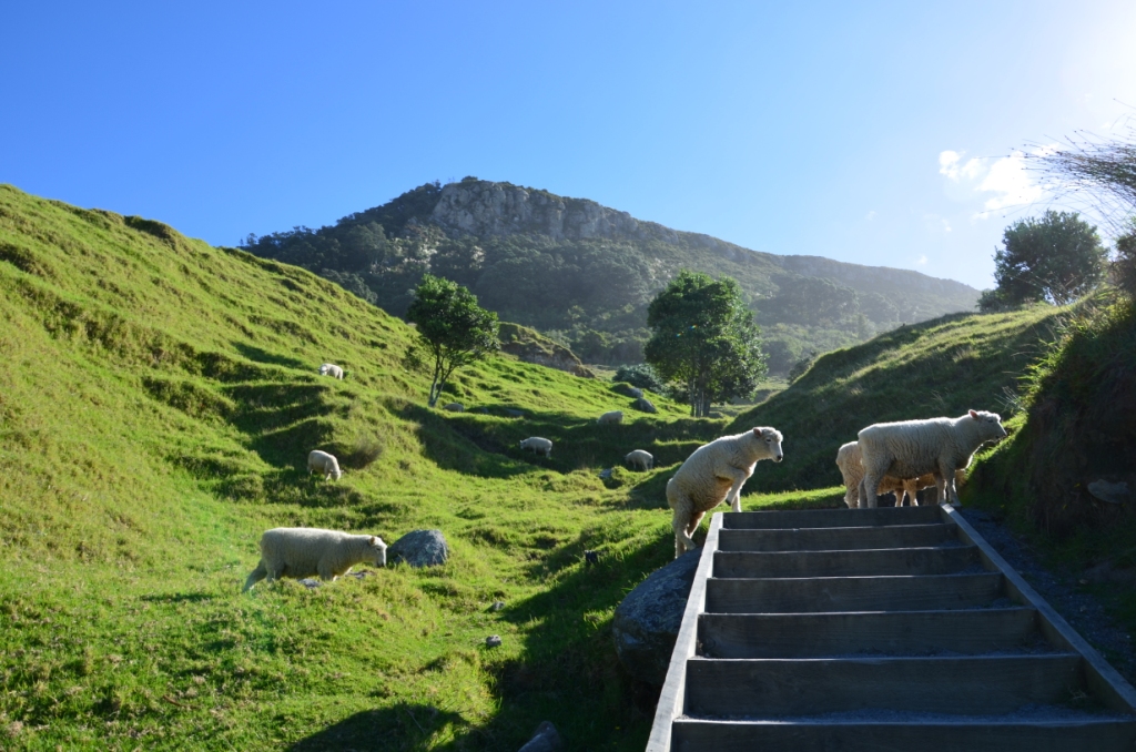 Po sprše a převléknutí se do suchého (v našem camprvanu) jsme vyrazili na trek na kopec. Na horu jsme šli asi 45 minut a byla to paráda. Konečně jsme chodili i mezi ovečkami.