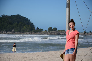 Městečko bylo okouzlující, nejprve jsme se procházeli po pláži a užívali si sluníčko. Tady je na pláži strašně moc mušlí, na jednom metru jich je tisíce a jsou různě veliký. Kluci (David a Michal) (Michal je s Martinou náš nový kamarádský pár, jsou oba z Velkého Meziříčí, je to fakt náhoda, že bydlí 30 km od nás a jsou moc fajn, jsou tu 10 dní a mají první práci stejně jako my) se vydali na útesy a já si sedla a odpočívala na pláži. Jenže ty vlny jsou tu strašně zrádný a opravdu veliký, jedna mě opět spláchla, docela nečekaně, takže zase bylo všechno oblečení mokrý a od písku. Jediný co jsem zachránila byl foťák.